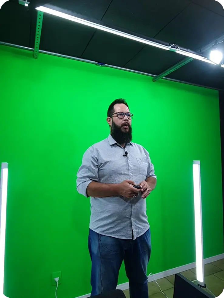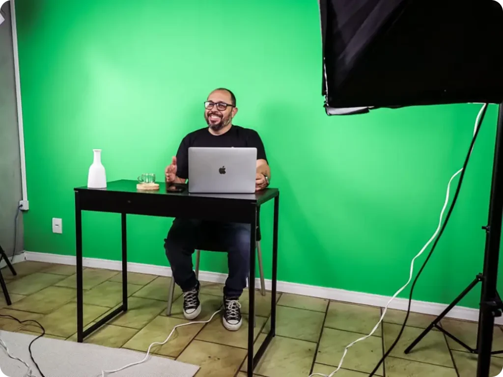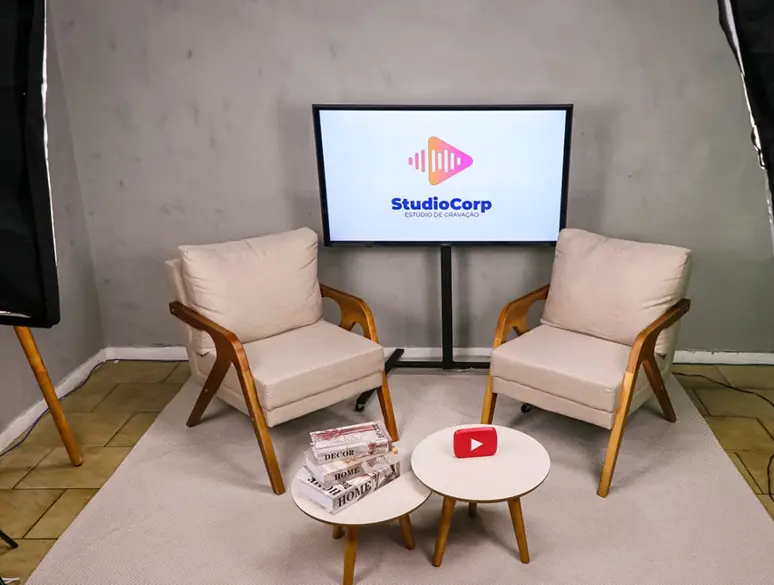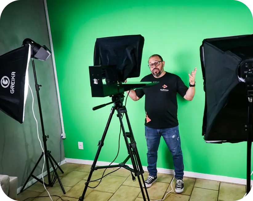 Estúdio equipado com chroma-key, microfones de alta performance, iluminação de cinema, tratamento acústico, garantindo qualidade impecável.